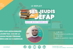 Chaque mois, Les Jeudis du Défap proposent une conférence en ligne ouverte à toutes et tous. Intervenants engagés, regards croisés et échanges interactifs permettent d’explorer les enjeux contemporains de la mission, de l’interculturalité, de la justice et de la spiritualité. Un rendez-vous mensuel pour approfondir sa réflexion, dialoguer et nourrir son engagement, où que l’on soit.